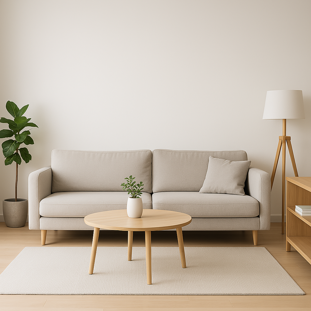 - 가구는 최소화: 소파 + 테이블 + 조명 정도로 구성