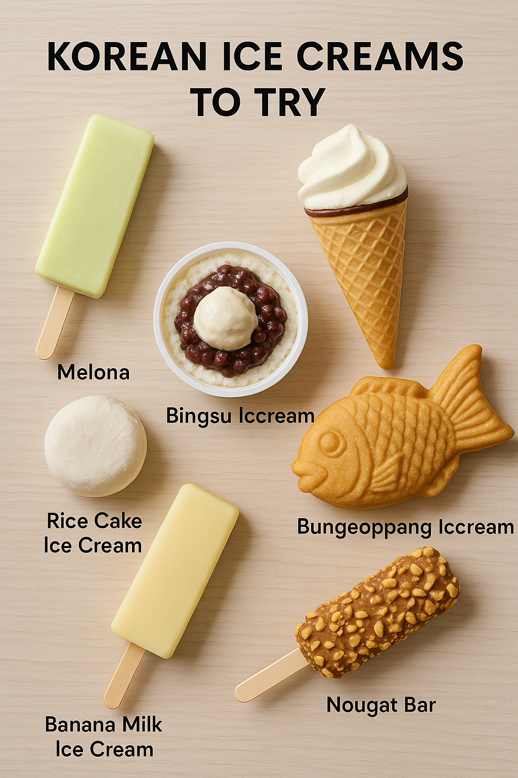 Melona: A creamy melon-flavored bar that's refreshing and smooth. - Bbungbbare: A classic vanilla cone with chocolate coating, familiar yet distinct. - Rice Cake Ice Cream: Chewy mochi-like rice cake filled with ice cream—an East-meets-West treat. - Bingsu Ice Cream: Shaved milk ice topped with fruits, red beans, or rice cakes—perfect for café culture lovers. - Bungeoppang Ice Cream: Fish-shaped waffle filled with vanilla and red bean, both cute and tasty. - Banana Milk Ice Cream: Inspired by Korea’s beloved banana milk drink, sweet and nostalgic. - Nougat Bar: Vanilla ice cream coated in crunchy peanuts and nougat—sweet, salty, and satisfying.