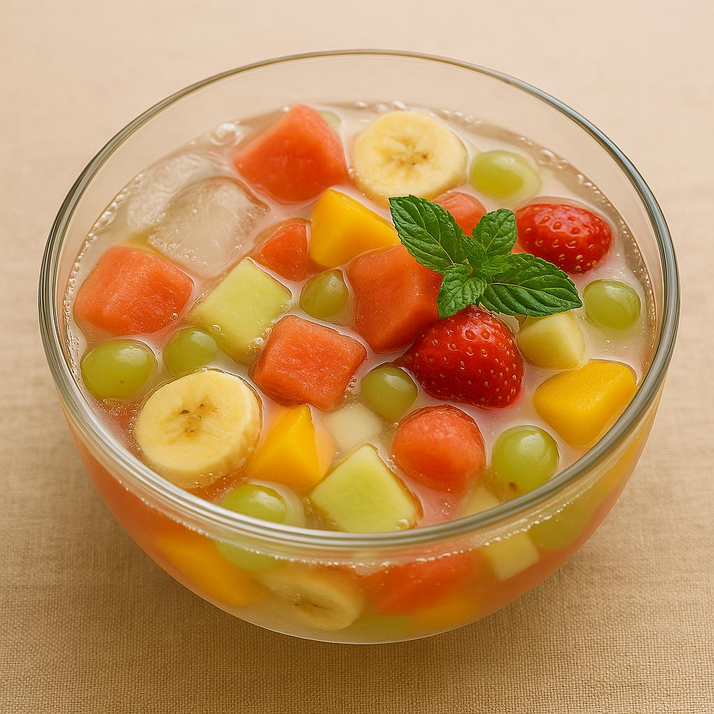 과일화채는 여러 가지 과일을 잘게 썰어 시럽이나 음료와 섞어 만든 한국식 디저트입니다. 시원한 얼음과 함께 먹으면 더운 여름날 최고의 간식이 되죠. 과일의 종류나 음료의 선택에 따라 다양한 맛과 색감을 낼 수 있어 아이들과 함께 만들기에 딱 좋습니다.